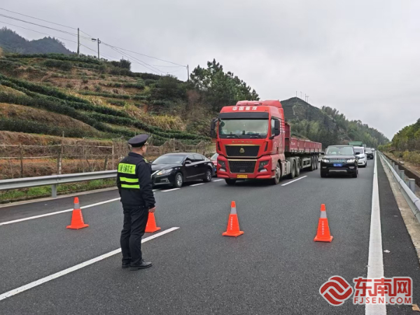 執法人員協助交警進行交通管制。寧德高速執法支隊供圖 事故車輛側翻橫亙于車道之間,車體嚴重變形,路面出現燃油滲漏。執法人員迅速聯合交警、養護等部門對事故區域實施臨時交通管制,在隧道入口及沿線通過可變情報板發布警示信息,引導后方車輛減速避讓,并對滯留司乘人員耐心開展現場解說,說明事故情況及安全注意事項,緩解群眾焦慮情緒。同時,執法人員協助救援力量對被困人員展開施救,利用反光錐筒、警示燈等設備對現場進行安全布控,防止次生事故發生。救援過程中,執法人員同步對事故造成的路產損失進行詳細勘驗,固定現場證據,為后續處置提供依據。