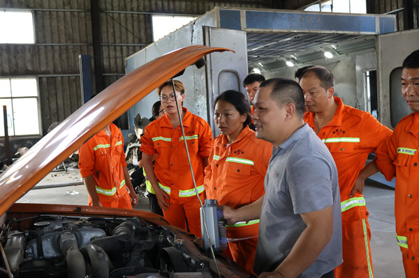 傅秋枝帶領養護工人在學習機械保養(中間為傅秋枝) “公路養護是良心活,一寸路面一寸責任?!笔歉嫡鹃L常掛在嘴邊的話,也是她十年如一日的堅守。 2018年1月,明溪部分地區出現降雪情況,國省干線上多地出現結冰現象,她和站內所有的養護工人一起撒鹽,抗冰災,當時,男性工人集體讓她休息:“女人在寒冷的天氣下作業是容易落病的?!彼词謱⒔獪噙M保溫壺:“冰災還分男女嗎?我喝這個跟你們一樣能抗?!?022年暴雨季,省道S308線突發山體滑坡,她頂著暴雨連夜設置警示標志,不顧自身安危,爬到邊坡上方查看山體開裂情況,憑借專業素養和豐富經驗,迅速給出科學解決方案,帶領隊員連續奮戰18小時搶通“生命線”;2024年7月,省道S219線王橋村路段附近因連遭大雨侵襲,導致路邊溝渠內淤積大量泥沙和雜物,水流不暢,影響了農田的灌溉需求,本著“為民辦實事”的原則,她立即調集機械設備和人員,趕赴現場,在高溫酷暑下解決群眾急難愁盼問題。