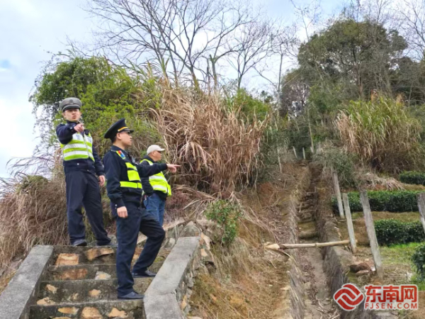 聯合檢查組查看邊坡排水溝。寧德高速執法支隊供圖