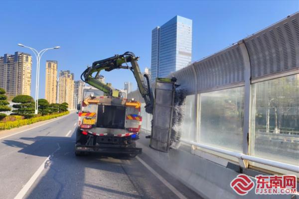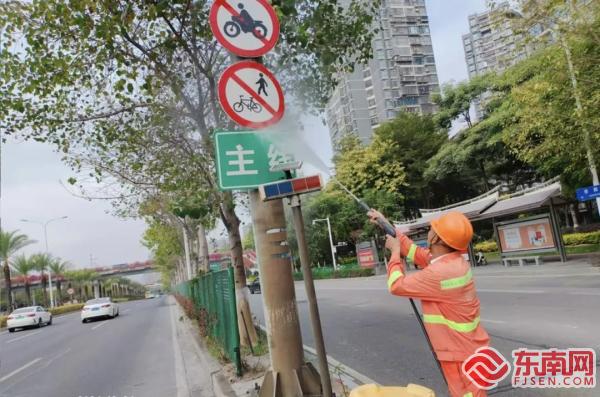養護工人用高壓水槍清洗公路標志牌(廈門公路中心供圖)