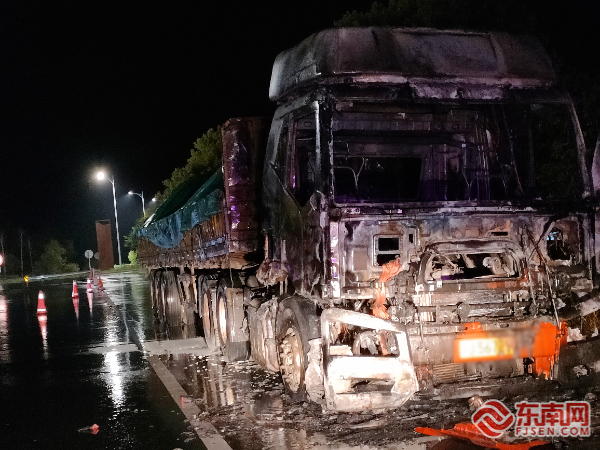 事故現場。寧德高速執法支隊供圖 據悉,停駐在服務區的閩J*****貨車駕駛室夜間突現明火,駕駛員被煙霧驚醒后迅速逃生。服務區工作人員發現險情后,立即啟動應急預案,第一時間報警并組織現場人員使用滅火器進行初期撲救,有效延緩了火勢蔓延。