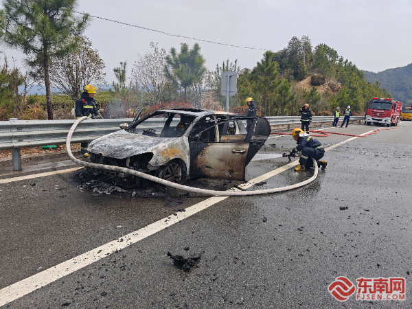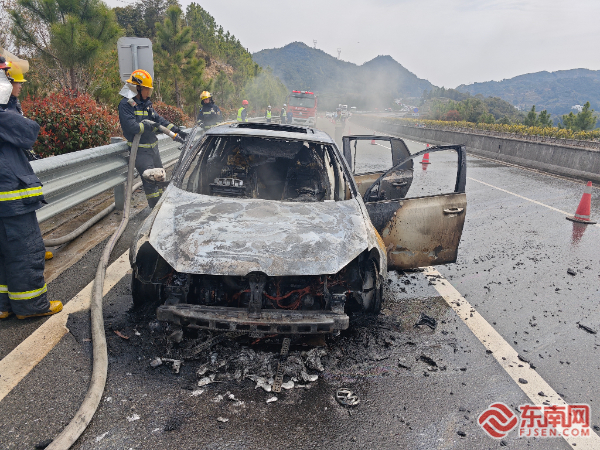 事故現場。寧德高速執法支隊供圖 抵達現場后,執法人員和高速交警立即對事故現場進行交通管制,疏散周圍車輛和人員,防止次生事故的發生。消防隊員迅速展開滅火行動,利用專業消防設備對起火車輛進行撲救。經過緊張救援,明火最終被成功撲滅,所幸此次事故未造成人員傷亡。
