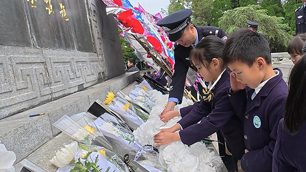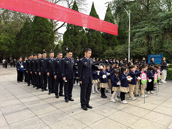 警民同心傳薪火 在巍峨的革命烈士紀念碑前,民警與師生們整齊列隊。當《義勇軍進行曲》響起,警徽在陽光下閃耀,民警與教師代表共同敬獻花籃,紅綢挽帶上“革命先烈永垂不朽”的金色大字,見證著跨時空的敬意。