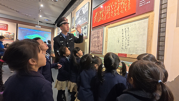 民警代表陳文捷在致辭中深情說道:“紅軍戰士吹響沖鋒號時,他們最小的就比你們大七八歲,正是無數這樣的青春熱血,換來了我們今天的幸福生活?!卑殡S著民警的引導,孩子們將手中的白花輕輕放到紀念碑基座上,這一刻,稚嫩的小手與堅定的警徽共同守護著紅色記憶。 攜手觸摸歷史溫度 在革命歷史紀念館內,玻璃展柜里泛黃的信件和舊書吸引了孩子們的目光,民警們擔任起了“臨時講解員”。