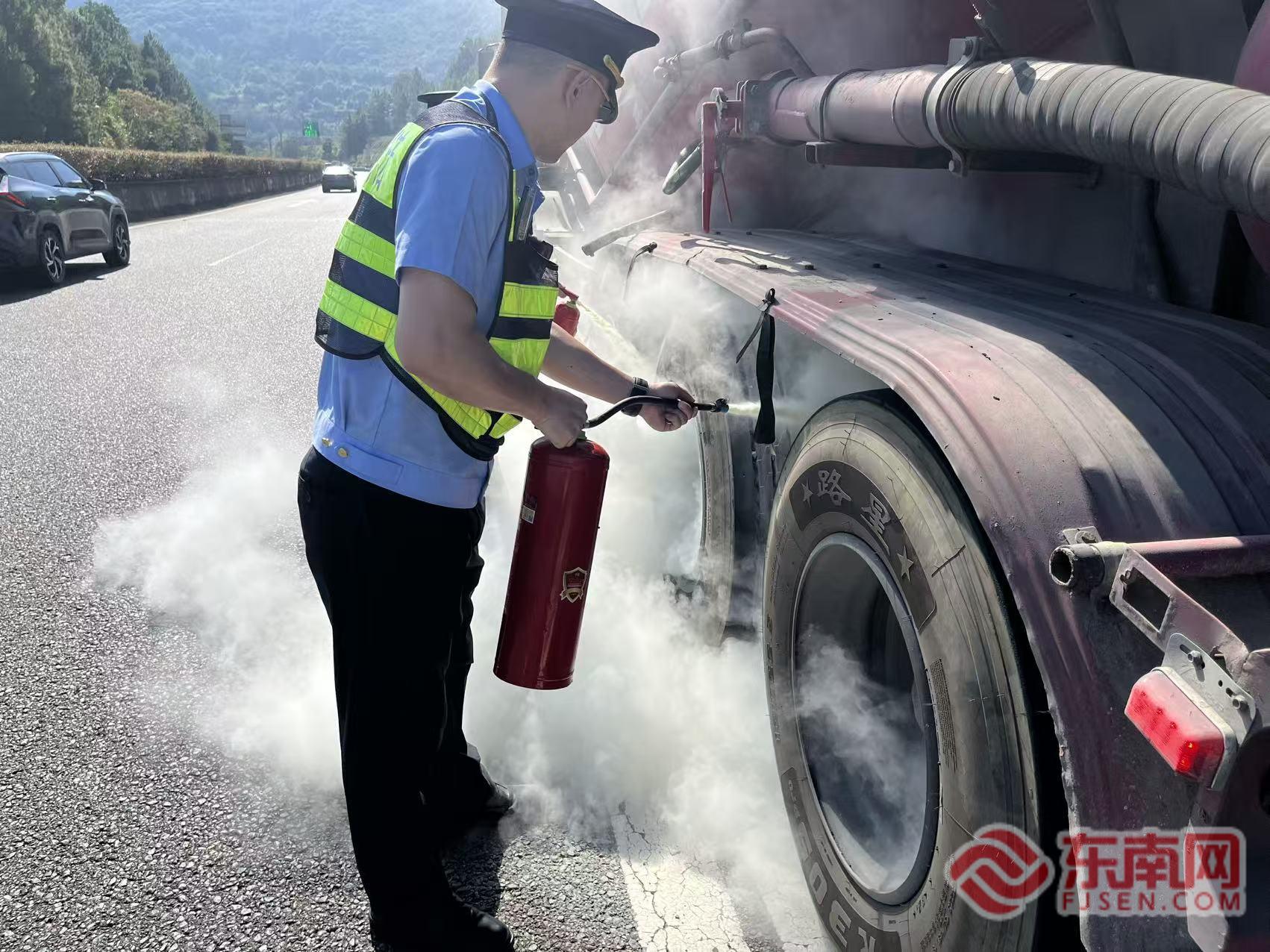 高速大貨車輪胎起火 高速執法員秒變“消防員”