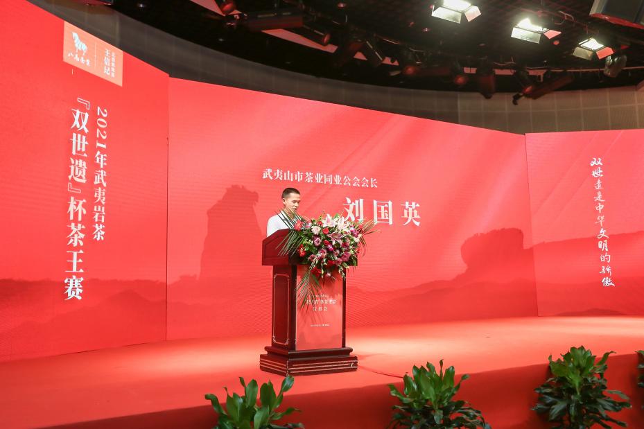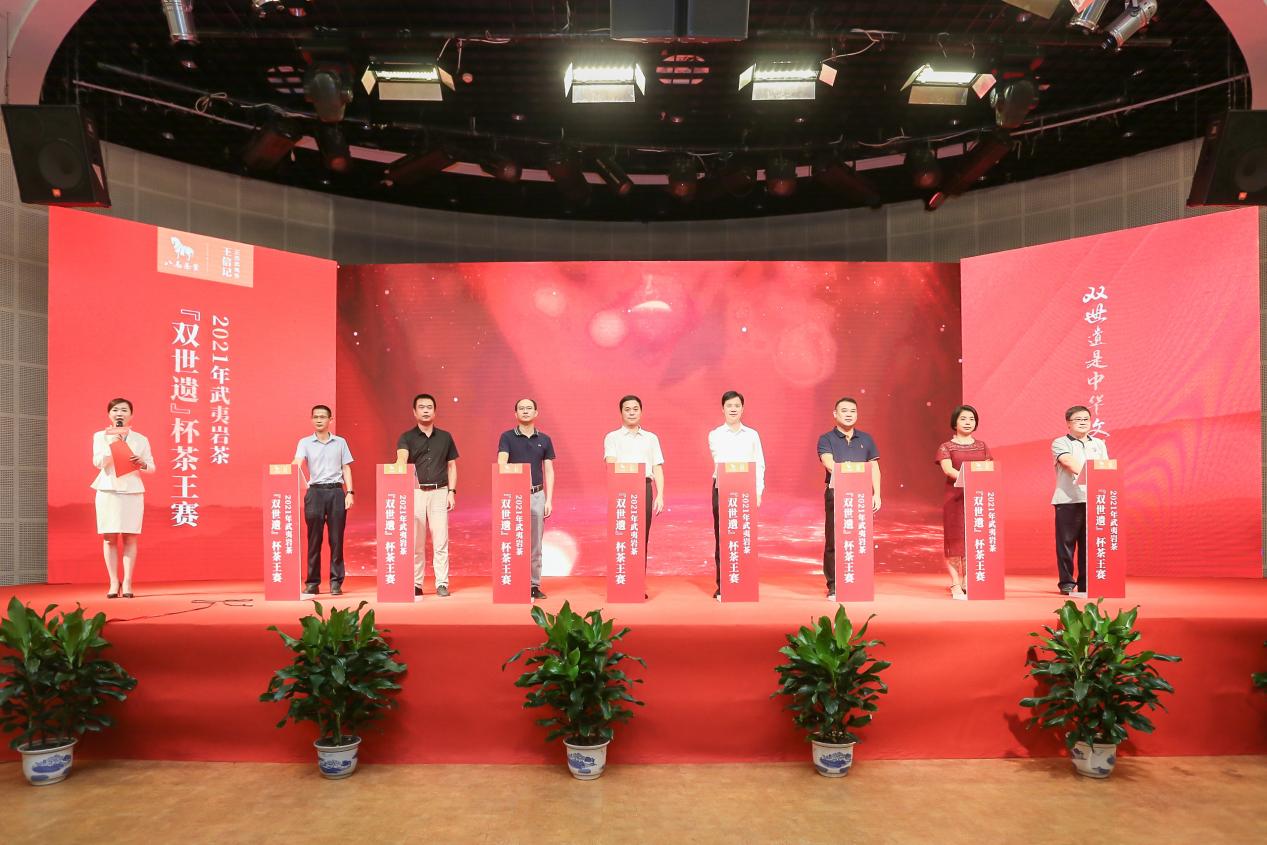之后,由武夷山市政協黨組書記陳先珍、武夷山市政府副市長范震昆、武夷山市茶產業發展中心主任王曉軍、武夷山市招商服務中心何梅芳、武夷山市場監督管理局副局長葉福開、武夷山市稅務局副局長李立新、武夷山市茶業同業公會會長劉國英、八馬茶業總經理吳清標的共同見證下,2021年武夷巖茶“雙世遺”杯茶王賽正式啟動。