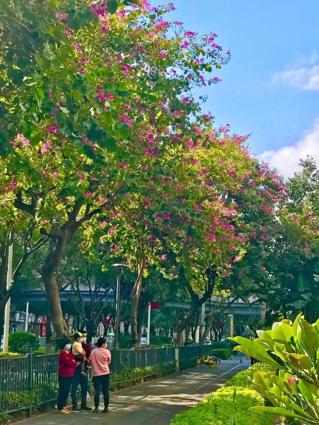 飛紅滴翠的色彩,千姿百媚的形態,湖濱南路洋紫荊正怒放著。