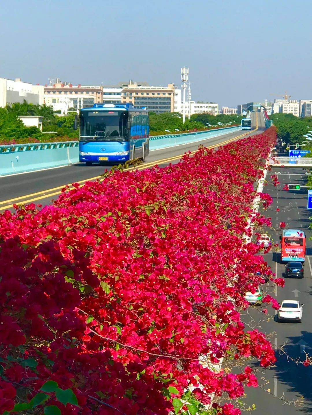含蕊紅三葉,臨風艷一城,經過三角梅的裝扮BRT車道成了青藤環繞,花木妖嬈的生動屏障。