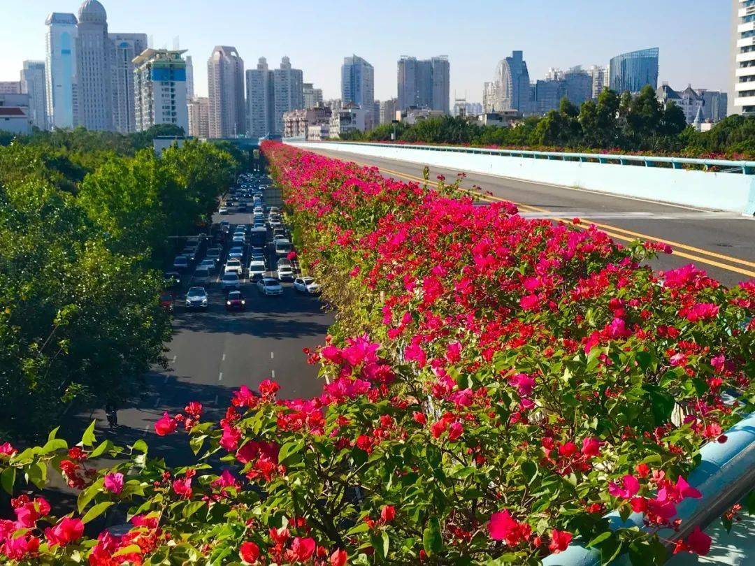 三角梅與城市的高架橋搭配讓整座城市的綠化效果看起來更有層次感、立體感,形成“半空綠化”成片連接的效果。