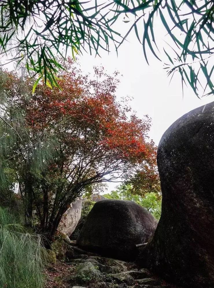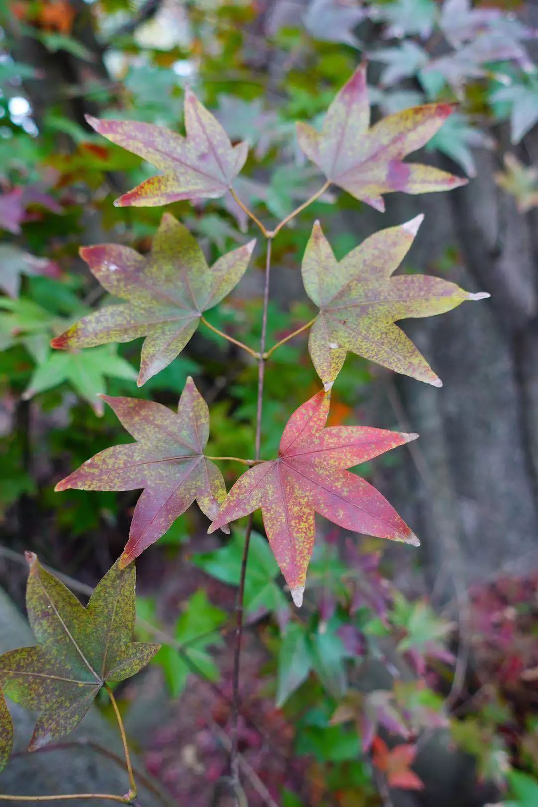謝雨真 攝 紅葉灑落在石階、石頭縫、小山包上,堆了一疊又一疊。五裂槭的枝干上,還掛著許多的紅葉,有的紅葉已經完全變色,有的泛黃,還有的正開始要起變化,黃葉上透著斑點的紅色。這些紅葉把整個山包渲染得詩情畫意。