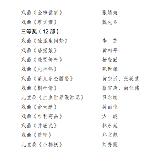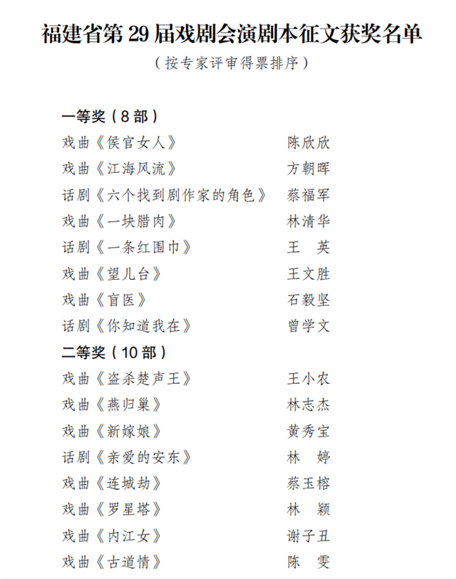 近日,福建省第29屆戲劇會演劇本征文獲獎作品公布,全省共30部劇本獲獎,其中戲曲《侯官女人》等8部作品獲一等獎,戲曲《盜殺楚聲王》 等10部作品獲二等獎,戲曲《獨孤生鬧夢》等12部作品獲三等獎。 由福建省文化和旅游廳主辦的福建省戲劇會演劇本征文活動,為常設性、專業性省級征文活動,每三年舉辦一屆。本屆劇本征文活動于2022年3月28日啟動,至今年3月31截稿,共收到省內外應征劇本105部,劇本評審分為初評與終評兩個階段,初評共篩選出37部劇本入圍終評,經終審評委對入圍劇本進行評議、投票,省文旅廳會議研究審定,最終產生30部獲獎劇本。本屆征文劇本總體數量、質量上較上屆有所提升,題材、體裁、風格更趨多元多樣,繼續保持我省在歷史劇創作等方面優勢的同時,現代戲創作呈穩步發展態勢,青年編劇人才成績喜人,一批探索創新之作應運而生。 本屆征文活動,參與作者既有資深的劇作家,也有初出茅廬的新作者,更有多年從事戲劇創作的中青年編劇。展現了我省新一輪舞臺藝術創作的最新成果,不僅為2024年舉辦第九屆福建藝術節儲備一批優秀劇本,也為我省舞臺藝術創作可持續發展夯實“一劇之本”的良好基礎。