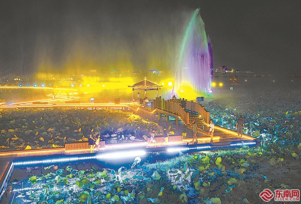 東南網8月4日訊(福建日報記者 施辰靜 攝影報道)夏季,在周寧,夜游鯉魚溪持續火爆。在社交平臺“火出圈”的鯉魚溪水幕燈光秀,已經成為不少游客到周寧打卡的必選項。圖為近日,在鯉魚溪景區的百畝荷花池中,音樂與燈光不斷變換,游客漫步在棧道上,在涼爽的水霧中欣賞水幕燈光秀。