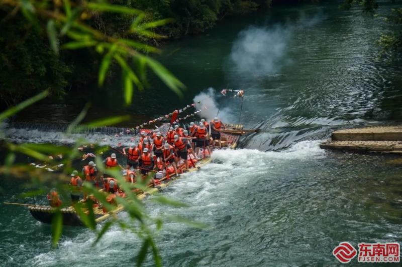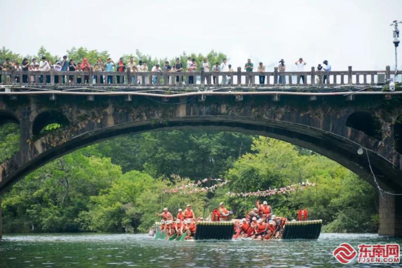 農歷五月初五,武夷山九曲溪一年一度的“端午洗河”如期而至。張筱惜 攝 九曲溪是武夷山最具代表性的風光,全長約10公里,面積8.5平方公里,每一曲都有不同景致的山水畫意,在過去也是當地人重要的航運通道。端午節祭河神活動是武夷山獨特的傳統習俗之一,俗稱“洗河”“洗溪”。 端午節正午時分,位于星村的九曲溪竹筏碼頭熱鬧起來。當地特色的竹筏懸掛上彩旗、彩帶,仿佛一艘斑斕的龍舟。由筏工組成的兩支隊伍乘著竹筏沿九曲溪順流而下,劃槳如翼,爭相競渡,途經五曲大橋、玉女峰、武夷宮等地,抵達終點竹筏裝運碼頭。筏工們沿途向溪水中灑下茶梗、大米、熟芝麻、鹽等物品,消災祛病,口中反復吟誦著吉祥的話語,祈禱一年風調雨順,五谷豐登,祝福九曲溪上的筏工、當地民眾和廣大游客平安健康?;顒訒r,九曲溪兩岸旌旗獵獵,觀看儀式的市民和游客人頭攢動,風中傳來的鑼鼓聲、吶喊聲響徹溪畔。