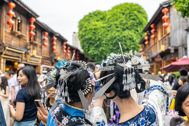 游客頭戴三條簪游覽三坊七巷。 2024年11月,福州傳統梳妝技藝(三條簪)入選福州市第八批非遺代表性項目名錄,讓這個原本“幾乎消失”的小眾民俗符號火了起來。戴上三條簪,換上傳統服飾,尋訪古街古巷,成為游客打卡福州的新方式。 三條簪已成為福州文旅體驗的“流量密碼”,在社交媒體上掀起一陣陣熱潮。去年初以來,李若彤、陳昊宇、萬妮達、婁藝瀟、趙小棠、安悅溪、王伊瑤等明星紛紛加入打卡行列,用不同的氣韻詮釋閩都非遺之美,引起網友廣泛關注。 去年11月,李若彤頭戴三條簪,在福州開啟尋福之旅。鏡頭下,她一襲古裝,發間銀簪閃耀,英姿颯爽。今年4月,趙麗穎頭戴大漆三條簪登上《上城士》雜志,將福州三條簪的熱度推向新高潮。今年5月,劉濤頭戴三條簪亮相央視節目《城市風華錄》,她穿梭在三坊七巷,向觀眾介紹閩都文化的深厚底蘊。上周,陳昊宇戴著三條簪亮相中國時尚產業盛典,讓世界看到了福州非遺的魅力。