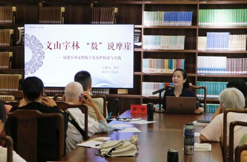 講座現場 東南網7月31日訊(本網記者 鄭琦 文/圖)7月26日下午,福建文旅講壇第18期邀請閩江學院研究生行業導師李寧擔任主講嘉賓,以“文山字林 ‘數’說摩崖——福建石刻文物數字化保護探索與實踐”為題,在福建省圖書館“八閩書房”精彩開講。作為“聲流金石 紙落云煙——2025年福建省圖書館中華傳統曬書活動”系列之一,本場講座旨在以數字化技術為切入點,探索傳統文化與現代科技的融合路徑,為石刻文物保護注入創新活力,推動文化遺產在當代語境下的活化傳承。 本場講座系統介紹了福建摩崖石刻面臨的保護困境與數字化解決方案。在福建省文物局指導下,福建省考古研究院與李寧及其團隊已完成省內萬余段摩崖的數字化采集,形成超15萬張數字影像。其中,“石刻文物微跡修復”和“古漢語AI翻譯及渲染應用”這兩項關鍵技術,在“連江定?!渡騾④姸êP率鹇涑尚颉繁奔啊叭A林寺宋高宗趙構御書殘碑”等案例中取得顯著成效,充分展現了數字化技術在石刻文物搶救性保護中的關鍵作用。從鼓山“忘歸石”鐫刻的蔡襄情懷,到烏山黎公巖銘記的抗倭功績;從于山演武廳銘承載的國防記憶,到鱔溪分水石刻閃耀的治理智慧……主講人通過生動案例展現了石刻文物作為歷史見證者的獨特價值?!白屇ρ率虖谋涞氖^變成會說話的歷史書,讓每個游客都能讀懂福州千年的故事——這是讓文物保護實現活化利用的初心?!崩顚幵谥v座中這樣詮釋他們的使命。