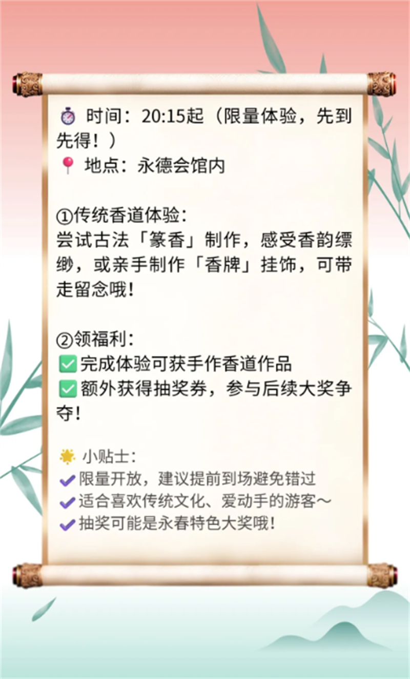 20:00-20:50 你是否聽過“無永不開市”的傳奇? 你可見過編織紙絲的千年絕活? 快快走進永德會館內場 來一場能看、能聞、能體驗的 非遺沉浸之旅