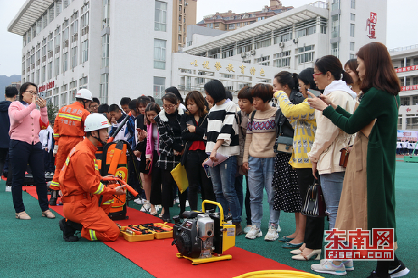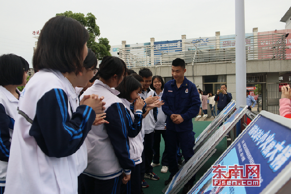 觀看消防火災案例展板。歐宇帆 攝 東南網寧德5月8日訊(通訊員 歐宇帆)今年的5月6日至12日為防災減災宣傳周,12日也是我國第11個全國防災減災日,昨日下午(5月7日),寧德市消防救援支隊走進東僑中學開展主題為“提高災害防治能力,構筑生命安全防線”的防災減災宣傳活動,通過開展模擬地震逃生演練、學習消防安全知識、參觀消防特種裝備器材等方式,普及防災減災知識,真正做到教育一個學生,帶動一個家庭,輻射整個社會的良好效果。