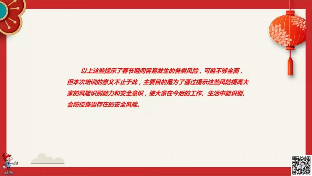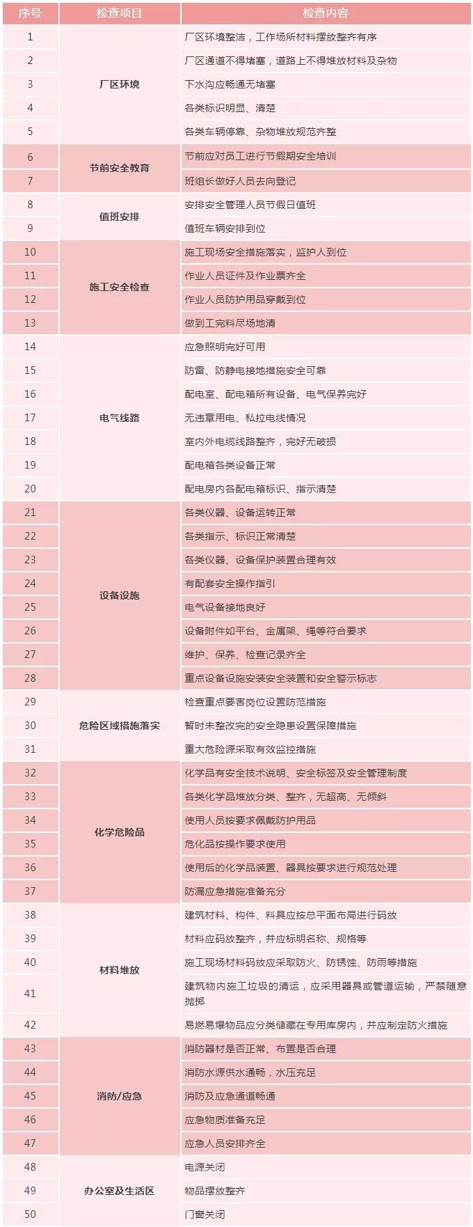 2020年春節即將來臨,越是歸心似箭 越要繃緊安全弦!企業如何確保節日期間的安全?生活中又有哪些需要警惕的風險? 這份節前安全教育培訓關乎我們每個人,一定要仔細閱讀! 節前安全檢查表 80項! 為確保節日期間的安全及節后復工復產能平穩有序進行,節前的安全檢查千萬要高度重視!節前,職工思想比較活躍,精力容易分散,是生產事故的易發期和敏感期,要牢固樹立“以人為本,安全第一”的思想,本著“先安全后生產,不安全不生產”的原則,認真做好安全檢查和員工節前安全教育工作。加強安全生產檢查,防止違章行為發生,確保安全生產受控。