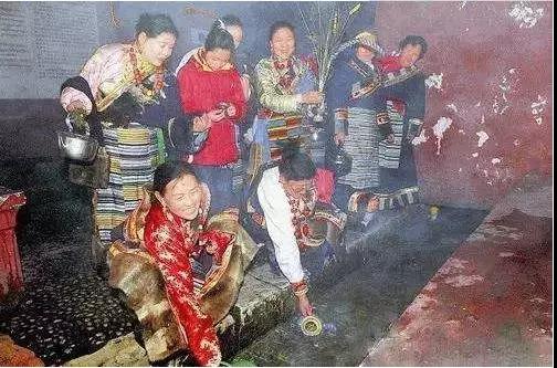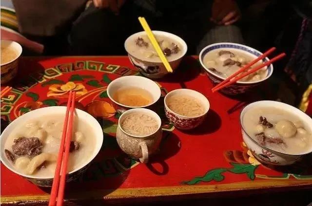 “古”即九,這里指二十九,“突”即突巴,是一種面粥。入夜,全家老小圍坐在一起吃一頓例行的“古突”,類似漢族新年的團圓飯?!肮磐弧笔怯妹娓泶?、羊肉、人參果煮成的稀飯。家庭主婦在煮飯前悄悄在一些面疙瘩里分別包進石頭、羊毛、辣椒、木炭、硬幣等物品。誰吃到這些東西必須當眾吐出來,預兆此人的命運和心地。石頭代表心狠,羊毛代表心軟,木炭代表心黑,辣椒代表嘴巴不饒人,硬幣預示財運亨通。大家相互議論,哈哈大笑一場,掀起歡樂的高潮。