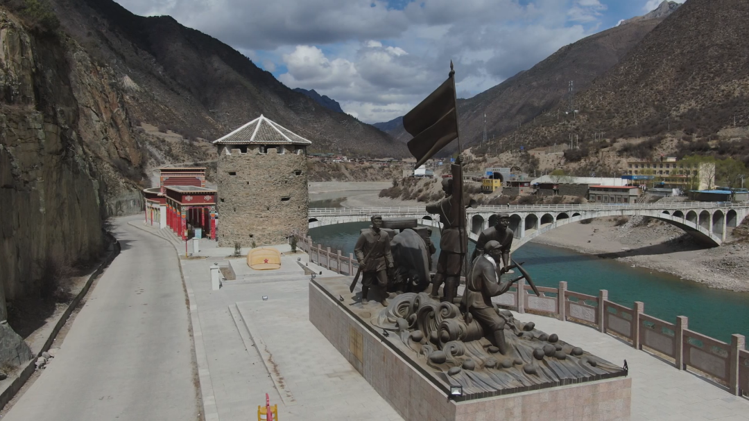 在崗托金沙江大橋新橋進藏端,一面巨大的浮雕墻映入記者眼簾。墻的左側,刻有“十八軍渡江紀念公園”等金色大字;墻的主體,重現了當年藏族群眾歡迎十八軍進藏的場面,有的給戰士獻哈達,有的為戰士彈奏扎念琴……