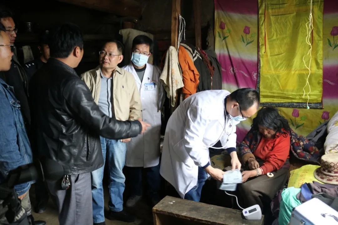 此次活動以為百姓提供優質便捷服務為原則,采取入戶義診、中途接待、入寺體檢等多種靈活形式,熱情耐心接待每一位就診群眾。在分散供養戶次旺巴姆家中,其丈夫玉珠尼瑪常年患有高血壓,通過詳細詢問病史、把脈、測血壓、聽診等方式,確診該患者患有高血壓、心房顫動、慢性心功能不全及甲狀腺腫大,現場免費發放相應藥品、告知用藥方式并進行健康指導。在患有精神分裂癥的特困戶落松家,因其無治療精神疾病的相關藥品,為保障患者病情得到控制,當場決定由縣人民醫院協調相應的藥品。途中,許多村民慕名而來,義診隊專家們不論是在山溝里還是斜坡上,均立即就地了解病史、檢查診斷、開方送藥。