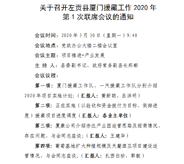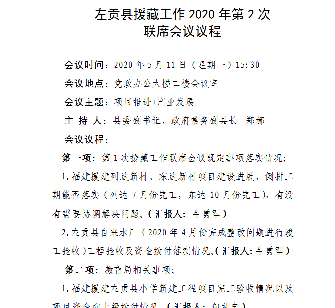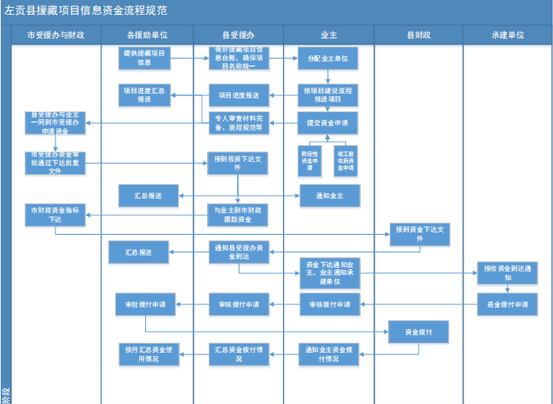 近日,左貢縣委辦印發《左貢縣援藏項目信息資金流程規范》,這是左貢縣為進一步規范援藏項目資金使用,提高項目效率的一個舉措。此前,援藏項目信息和資金流程存在多頭參與、信息溝通滯后以致援助單位信息無互通、項目推進情況不同步、資金到位及撥付情況不明確等問題,為此,福建省第九批援藏工作隊左貢工作組牽頭負責起草,全面優化流程,規范援藏項目相關信息、資金等業務流程管理及各環節辦理時限。 2020年5月11日,左貢縣召開左貢縣2020年第2次援藏工作聯席會議上,各相關業主單位就本年度第1次援藏工作聯席會議既定事項落實情況及近期援藏項目進行了匯報;閩九援左貢工作組、中國一汽援藏隊通報了近期援藏工作動態,與會人員共同討論了十四五援藏規劃重點內容以及如何進一步規范援藏項目資金使用流程等。