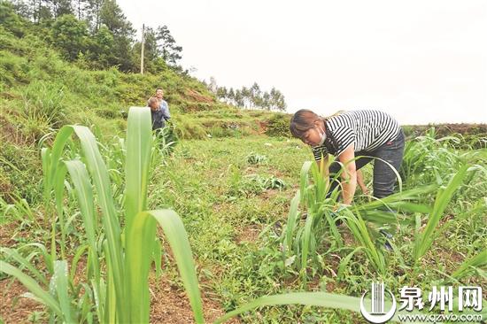 林玉麗等數名已經穩定脫貧的貧困戶忙碌收割菌草餵養雞鴨魚