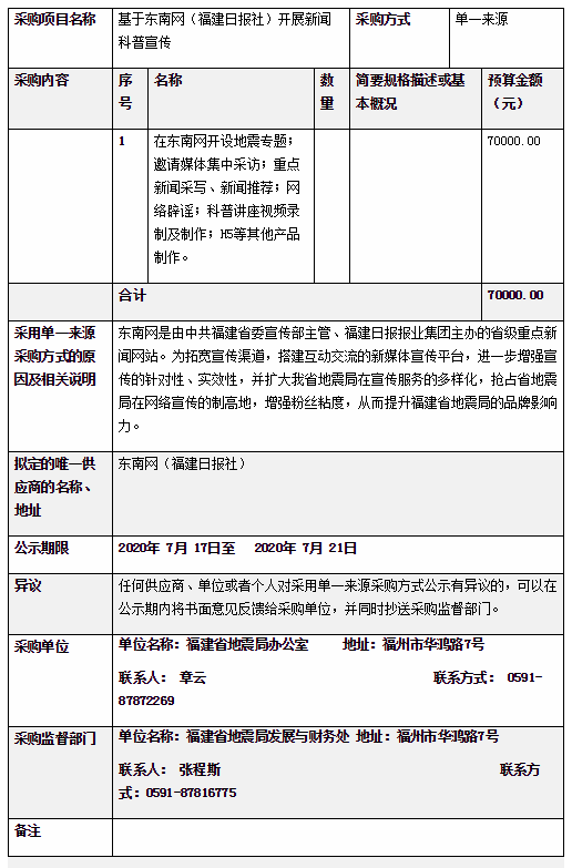 我局對基于東南網(福建日報社)開展新聞科普宣傳擬采用單一來源采購方式進行采購,現公示如下: