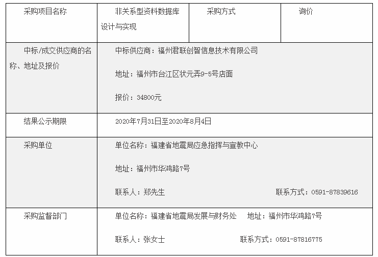 根據福建省地震局應急指揮與宣教中心2020年7月21日公布的《非關系型資料數據庫設計與實現詢價公告》(http://www.fjdzj.gov.cn/ar/2020072114000011.htm),截止2020年7月28日18時,共收到三家供應商的響應文件。2020年7月30日16時,采購詢價小組對上述三家供應商進行綜合評定,在滿足采購文件實質性響應要求的基礎上,擬確定報價最低的“福州君聯創智信息技術有限公司”為成交供應商。