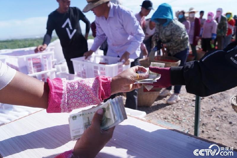 一張木桌,一臺秤,村民排起長隊等待將剛采摘的枸杞過秤。在這里,一斤枸杞的收購價格是1.2元。