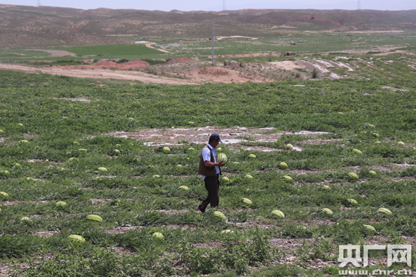 中衛市中寧縣喊叫水村硒砂瓜田(央廣網記者 母晨靜 攝) 隨后,記者又來到中衛市中寧縣喊叫水村硒砂瓜田。中衛位于寧夏中西部,黃河前套之首,水土光熱等農業資源稟賦獨特。硒砂瓜又被稱為“石頭縫里長出的西瓜”,主要集中在中部干旱帶環香山地區。