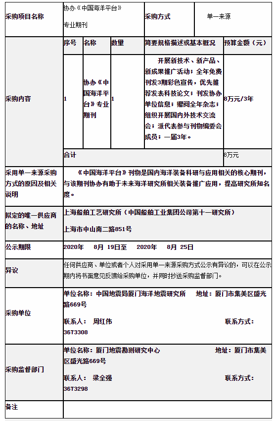 我所對協辦《中國海洋平臺》專業期刊擬采用單一來源采購方式進行采購,現公示如下: