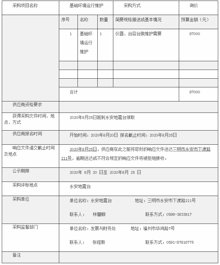 依據《福建省地震局采購管理實施細則》要求,現對永安地震臺“基礎環境運行維護”進行公開采購,現歡迎有意向、合格的供應商前來參加。