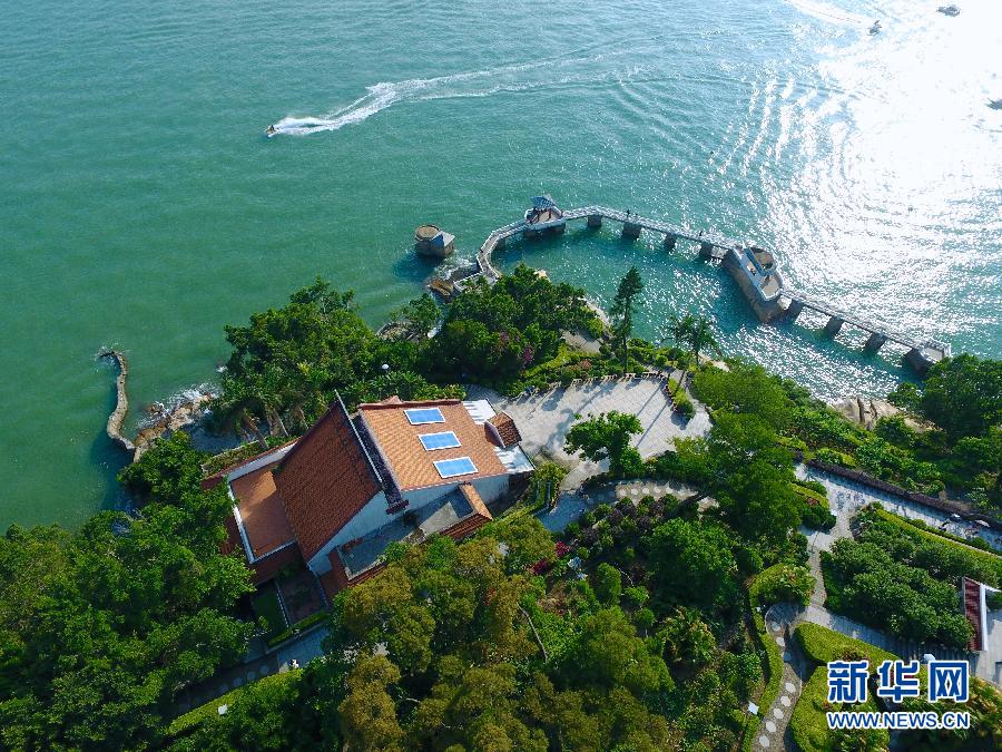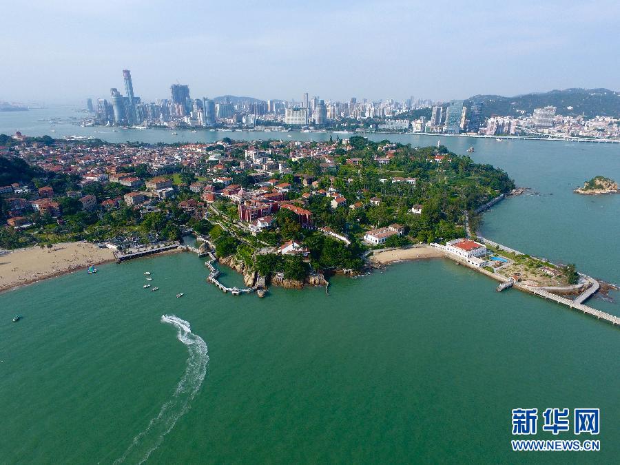 空中俯瞰,鼓浪嶼歷史風貌建筑與鷺江海峽對岸的現代建筑遙相輝映。新華社記者姜克紅攝 2017年7月8日,中國福建省鼓浪嶼在波蘭克拉科夫舉行的世界遺產大會上獲準列入世界文化遺產名錄。鼓浪嶼隸屬廈門市,是廈門島西南隅一座面積1.8839平方公里的小島。