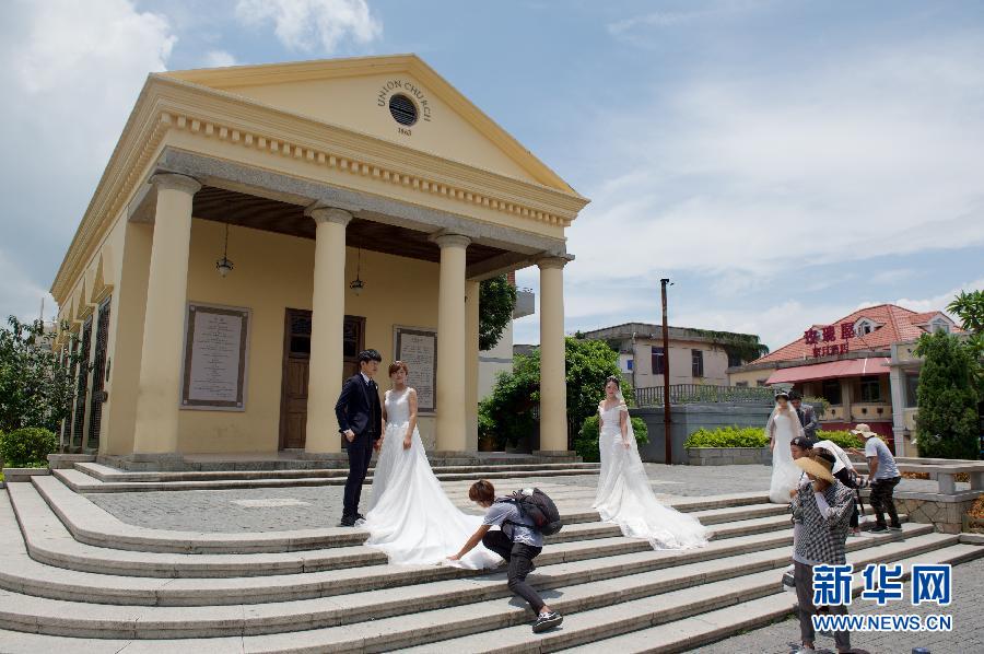 鼓浪嶼代表性歷史建筑協和禮拜堂前幾對情侶在拍攝婚紗照。新華社記者姜克紅攝 “鼓浪嶼:歷史國際社區”是中國一處獨特的、見證了中國在全球化發展早期階段實現現代化和中外多元文化交流與融合歷程的活態文化遺產,反映出中國傳統文化深厚而堅韌的文化根基和對世界不同文化、價值觀的包容、吸納與發展。