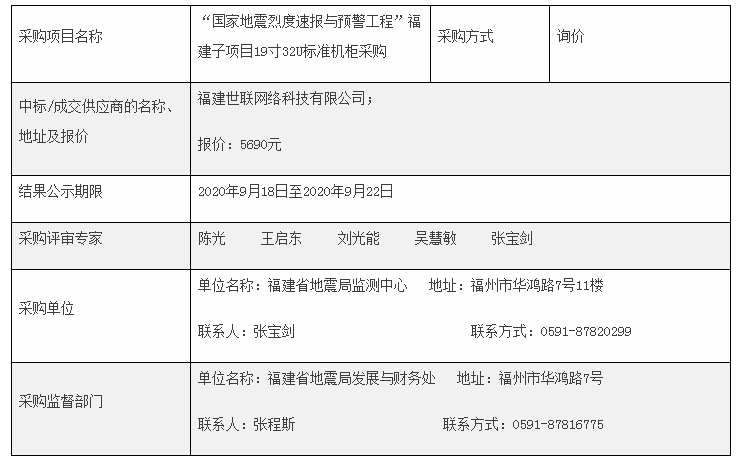 監測中心國家地震烈度速報與預警工程福建子項目標準機柜采購結果公示