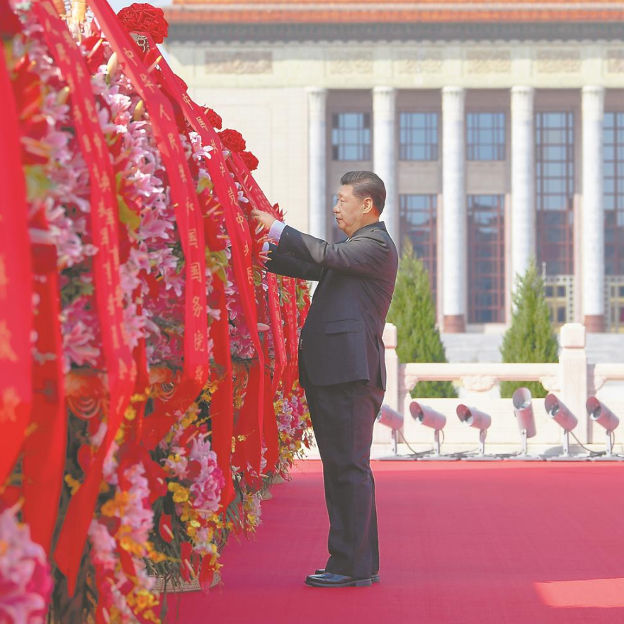 ?9月30日上午,黨和國家領導人習近平、李克強、栗戰書、汪洋、王滬寧、趙樂際、韓正、王岐山等來到北京天安門廣場,出席烈士紀念日向人民英雄敬獻花籃儀式。這是習近平整理花籃上的緞帶。 新華社記者 申宏 攝