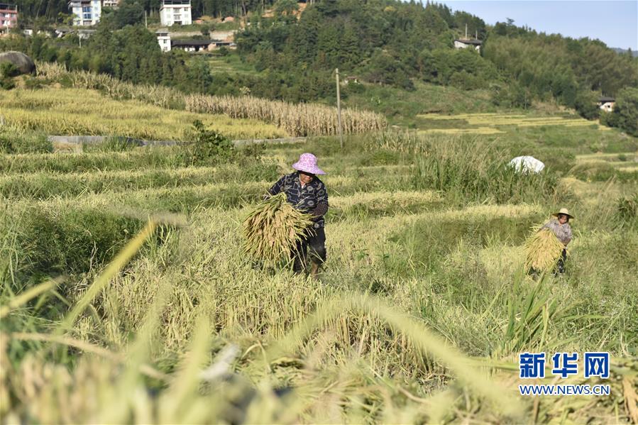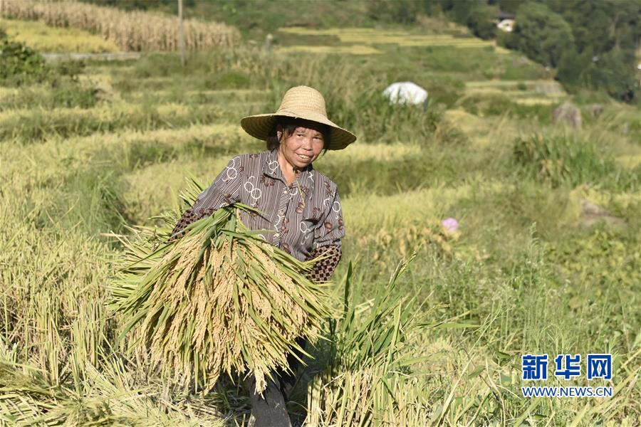 10月2日,福建省三明市尤溪縣聯合鎮東邊村村民在聯合梯田上搬運稻谷。新華社記者 林超 攝
