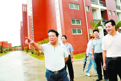 曹德旺(左一)到他捐助的中學了解校舍建設情況。福建日報記者 游慶輝 攝
