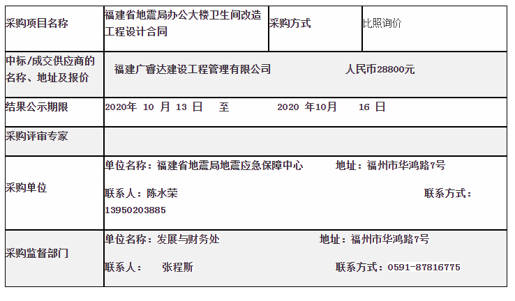 福建省地震局辦公大樓衛生間改造工程設計采購結果公告