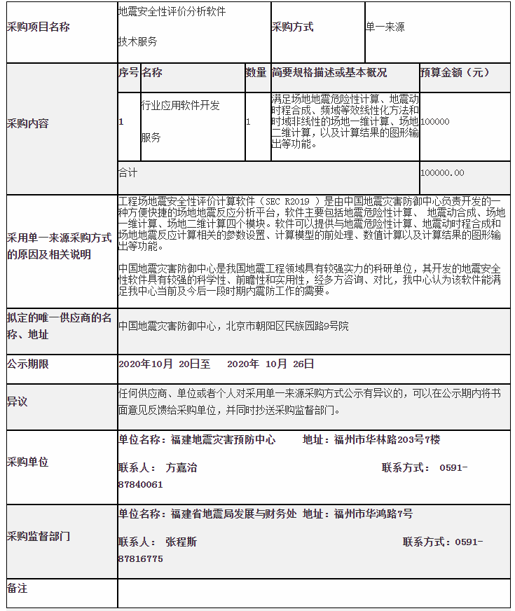福建地震災害預防中心地震安全性評價分析軟件技術服務采用單一來源采購公示