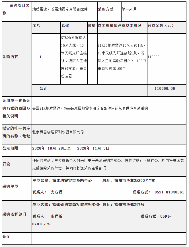 地震災害預防中心“地質雷達、淺層地震專用設備配件”單一來源采購公示