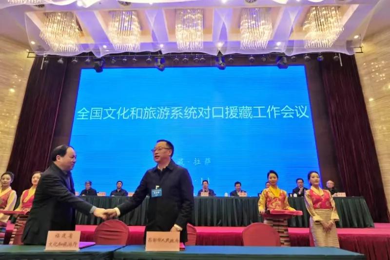 11月9日,全國文化和旅游系統對口援藏工作會議在西藏拉薩舉行。文化和旅游部黨組書記、部長胡和平,西藏自治區黨委書記吳英杰,西藏自治區黨委副書記、自治區主席齊扎拉出席并講話。西藏自治區領導嚴金海、劉江、許雪光、多吉次珠、普布頓珠、王亞藺出席。會議由文化和旅游部黨組成員、副部長李群主持。 會上,昌都市市長陳軍和福建省文化和旅游廳二級巡視員劉聯榮代表雙方簽訂了《昌都市人民政府與福建省文化和旅游廳聯合實施“閩昌唐卡漆畫小組團式援藏項目”戰略合作框架協議》。按照協議,為深入貫徹落實中央第七次西藏工作座談會精神,“十四五”期間,雙方將確立唐卡漆畫人才聯合培養、作品成果聯合展覽、創新創業工作室聯合設立、產業IP聯合開發等項目合作機制,共同推動兩地非遺項目“唐卡”“漆畫”融合創新,促進閩昌兩地優秀傳統手工融合和優勢文化產業合作,形成獨具特色的“閩昌唐卡漆畫”文化品牌,為實現閩昌兩地傳統工藝振興和非遺扶貧提供新的發展思路,有效推進昌都市與福建省文化交流合作向更高水平、更深層次、更寬領域發展。