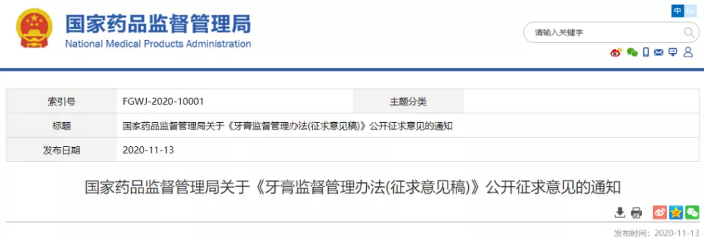 11月13日,國家藥品監督管理局發布關于《牙膏監督管理辦法(征求意見稿)》(下稱“辦法”)公開征求意見的通知。