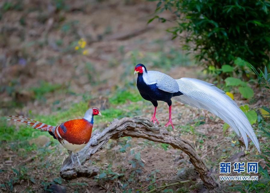 在永安市青水畬族鄉豐田村,白鷴(右)與白頸長尾雉相伴在林邊休憩(11月21日攝)。新華社記者 梅永存 攝 |