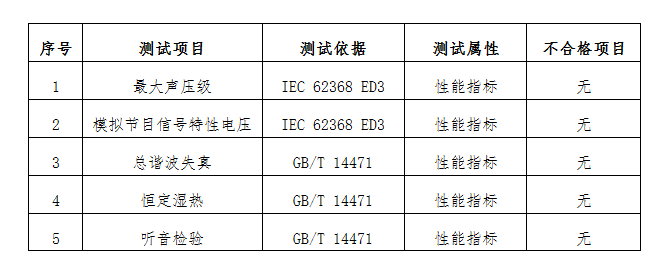 本次比較試驗樣品委托福建省產品質量檢驗研究院以GB/T 14471-2013 《頭戴耳機通用規范》等標準,對樣品聽音檢驗、最大聲壓級、模擬節目信號特性電壓、總諧波失真、恒定濕熱試驗5個項目進行測試。比較試驗結果僅對購買的樣品負責,不代表同品牌不同批次、不同型號商品的質量狀況。