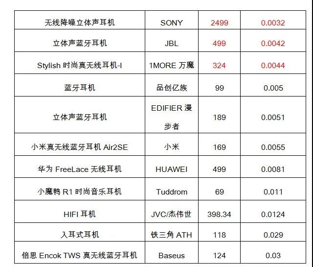 下表對本次耳機樣品的售賣價格和諧波失真數據進行了比對: