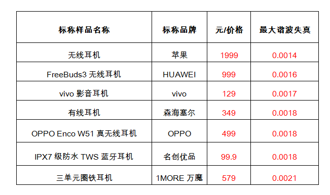 最大諧波失真數字越小,聽覺體驗越好,根據上表的統計數據可以看出,在本次的諧波失真試驗中蘋果無線耳機、HUAWEIFreeBuds3無線耳機、vivo影音耳機、森海塞爾有線耳機、OPPO Enco W51真無線耳機、名創優品IPX7級防水TWS藍牙耳機、1MORE萬魔三單元圈鐵耳機、SONY無線降噪立體聲耳機、JBL立體聲藍牙耳機、1MORE萬魔Stylish時尚真無線耳機-I表現較佳,最大諧波失真均小于0.5%。