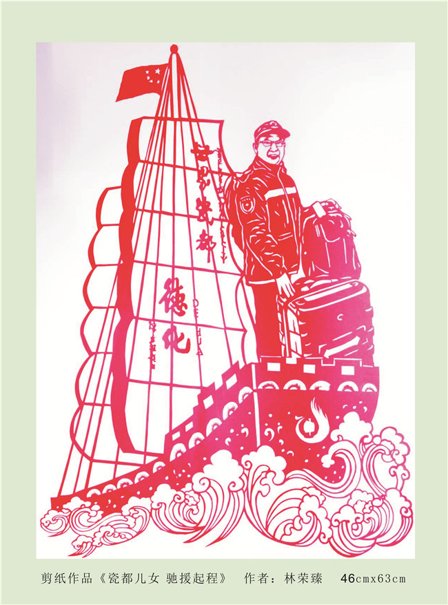 剪紙作品《瓷都兒女  馳援起程》,作者:林榮臻