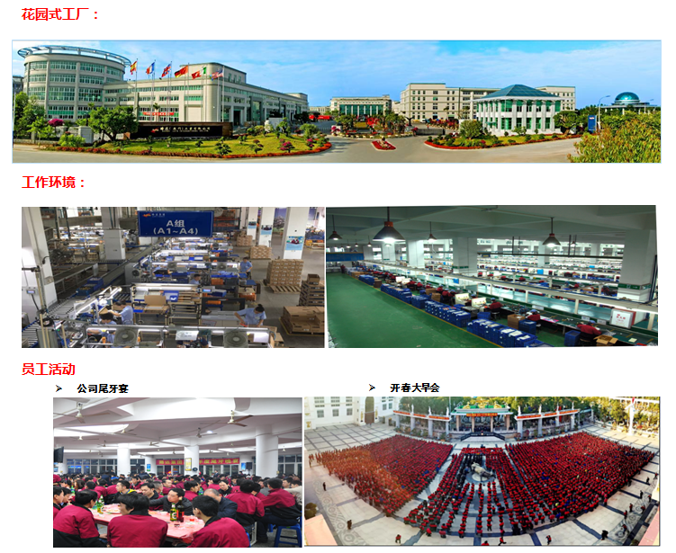 福利活動:員工活動室提供各種健身器材、兩年一屆運動會、迎新晚會、員工生日禮券;六一兒童節活動、節日禮金/禮品;帶薪年假;年度優秀員工家屬免費廈門游;職業培訓及國家認可的技能資格鑒定站;員工重大疾病救助基金、助學基金、員工意外險。